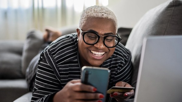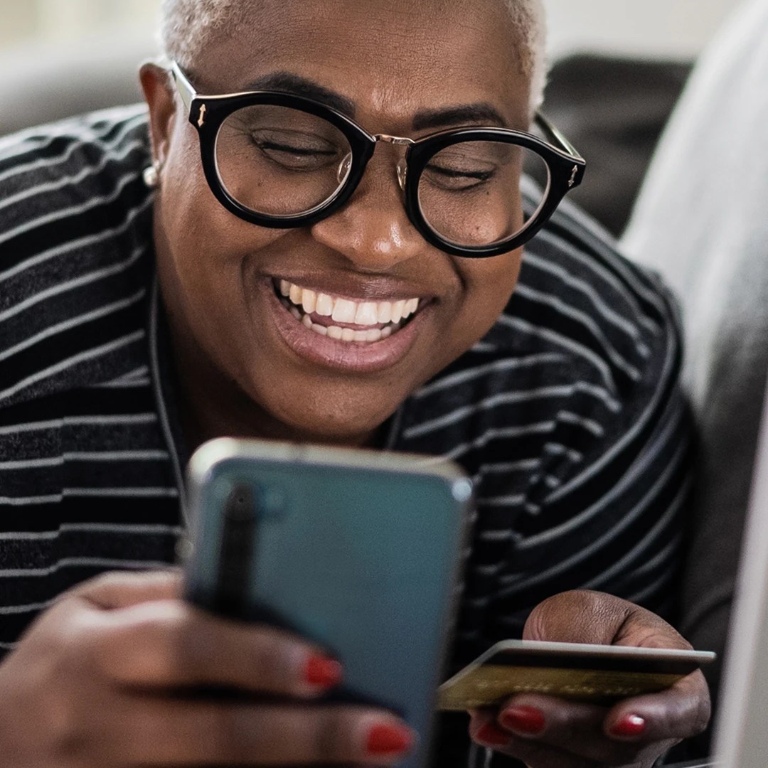 Person lying on a couch, smiling at a smartphone while holding a credit card, with a laptop nearby in a softly lit room.